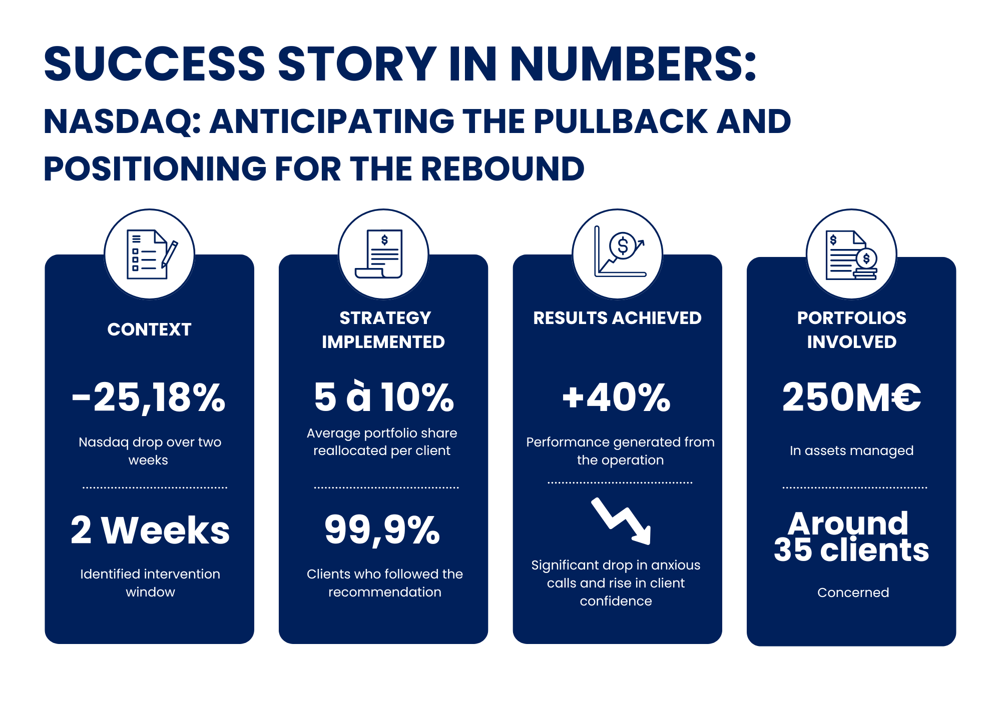Between April 7 and April 21, the Nasdaq fell by 25.18% (source: Nasdaq Index, April 2025). Since our entry point, the market has rebounded by approximately 40%, allowing clients to benefit from the recovery momentum.